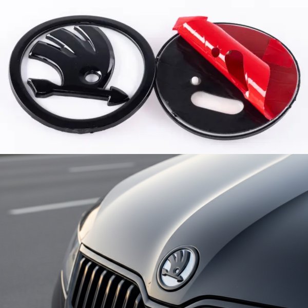 Емблема значок на капот, багажник Skoda Шкода 90мм нового зразку, в чорно білому кольорі
